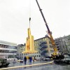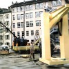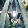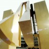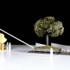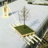 The garden is heavy and perception of this weightiness is important. The spectator must become aware of how little strength is required to move it. This is made possible by the recourse of technical means: a series of reduction ratio boxes located in one of the columns of the technical component of the sculpture. The strength of just one hand turning the crank is sufficient to move, on four rails, tons of tree, wet soil and metal of which the garden is composed.This movement sets the garden above an empty drop which belongs to the architecture of the building, allowing light to fill sports halls located in the basement. The drop also belongs to the sculpture, presenting an image of the danger with which nature, at any moment, could be threatened. This conjunction creates a close relationship between the piece and its surroundings.
